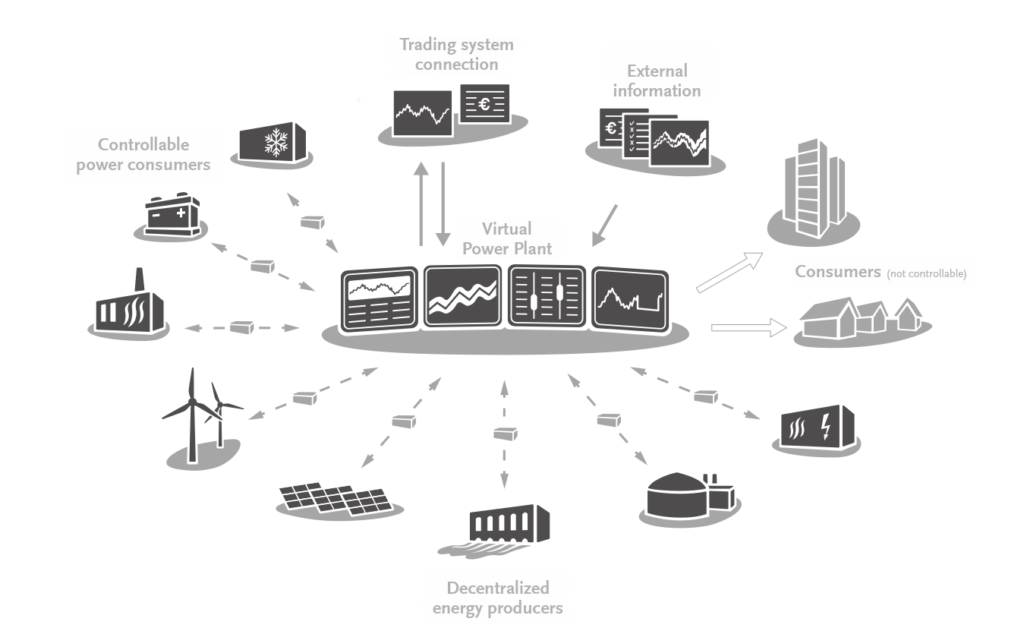 As depicted in the figure below, VPP is a web of decentralized power generation units, controllable as well as non-controllable power consumers, energy storage units and a central control IT system (VPP software). Using real time communication between participating units and the VPP software, the latter is able to monitor, forecast and dispatch the networked units. The portfolio formed by these aggregated units becomes a single dispatchable resource that offers flexibility coming from networked units e.g. ramping up and down of power production and power consumption on short notice. With such characteristics, VPP optimizes generation and consumption, as well as storage assets, maximizing energy production and enabling efficient energy distribution to end users.