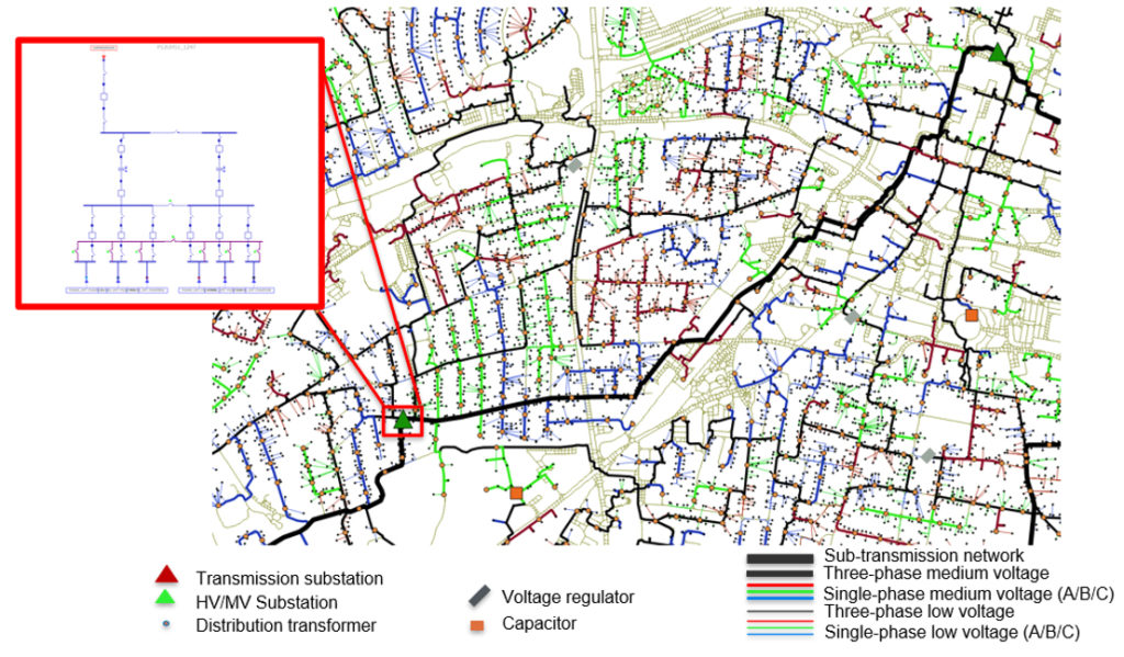When simulating responses to outages or disasters, integrated protection equipment and feeder reconfigurability can show how a real distribution system could respond to outages and what type of post-disaster responses could be deployed. This provides valuable data for resilience modelers to improve responses and operation under threats to the power system. Feeders also contain voltage control equipment such as capacitors and voltage regulators, depending on how the feeder is loaded and whether it’s in an urban or rural location. Analyzing advanced control strategies for this equipment could improve voltage management and allow increased adoption of EVs or solar deployment without significant upgrade costs.