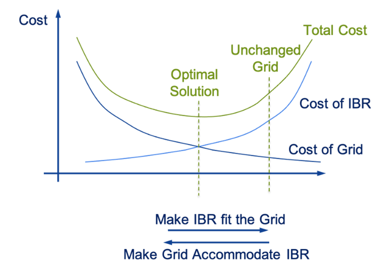 My starting point is that GFM IBRs and the grid have to be compatible, but the point of compatibility need not be where it was for synchronous machines. Compatibility is a two-sided challenge: making IBRs fit to work in our grid and making our grid fit to accommodate IBRs. How much of each we do should be determined by what achieves minimum system cost, as illustrated in the figure. As an example, making IBRs supply short-term overload or fault current exactly like synchronous machines is expensive. We should be looking at whether there is a lower-cost solution by adjusting our grids somewhat to operate at lower fault currents of IBRs, but not to the point where grid costs become excessive. I doubt we can construct an exact version of the cost-curve like the one in the figure, but we should have in mind the principle of balancing the cost burden.