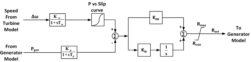 The model consists of four components: generator, wind turbine, pseudo governor, and rotor resistance controller. The generator is an induction generator with provisions for adjusting its rotor resistance via the rotor resistance controller. This controller has as inputs the rotor speed and generator electrical power; the model calculates the portion of the available rotor resistance to be added to the rotor resistance included in the generator module.[3]