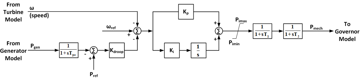 The pseudo governor model wt2p is an attempt to simplify and generalize calculation of the aero-torque. This model was designed and developed after thorough investigation of aero-dynamic characteristics and pitch control of several vendor specific wind turbines. Finally the arrangement shown below was suggested. The model uses two inputs, one in terms of the blade rotor speed deviation and another in terms of the real power at the machine terminals. These two inputs combined together are processed by a PI controller with non-wind-up limits. The filtered output is the mechanical power on the rotor blade side which is used by the wt2t model.